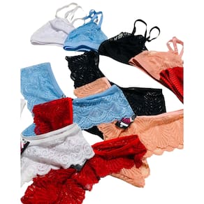 Sutiã desenvolvido em renda. Modelagem triangular com barra alongada. Não possui bojo nem aro. Alças finas com regulagem e duplas na parte posterior. Com fechamento atrás. Forro em malha no busto.