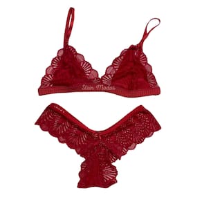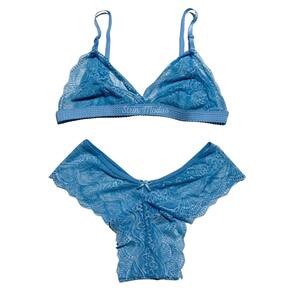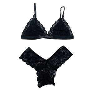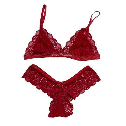 Sutiã desenvolvido em renda. Modelagem triangular com barra alongada. Não possui bojo nem aro. Alças finas com regulagem e duplas na parte posterior. Com fechamento atrás. Forro em malha no busto.