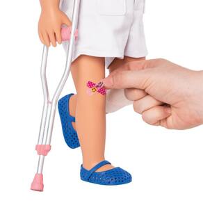 Conjunto de roupa com muletas para bonecas de 46 cm, para ficarem fofas durante a recuperação. As bonecas Our Generation estão sempre em movimento e uma coisinha como uma simples perna quebrada não pode impedi-las! Todo mundo precisa de cuidado e carinho e essa roupinha tem tudo o que é preciso para cuidar muito bem das bonecas. Inclui um macacão branco super fofo e uma camiseta com estampa divertida, além de um par de sapatos e curativos coloridos para cuidar do dodói da boneca. Boneca vendida separadamente.