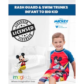 Prepare-se para um pouco de magia da Disney ao vestir o seu pequeno neste adorável conjunto de natação do Mickey Mouse. Este lindo conjunto inclui uma camiseta rash guard de manga curta e shorts com arte colorida do amigo com orelhas de rato do seu filho com aparência legal de óculos de sol e pronto para surfar nas ondas. Feito de um material de secagem rápida e com FPS 50+, este conjunto de roupa de banho listrado vermelho, branco e azul é perfeito para aqueles dias ensolarados na praia. - Camisa de natação de manga curta oficialmente licenciada pelo Mickey Mouse da Disney e calça de natação fofa e estilosa - Mangas raglã contrastantes; design incrível de impressão por sublimação; material FPS 50+ para proteção UVB e UVA e tempo de sol sem preocupações; shorts de natação forrados de malha; tecido elástico em 4 direções para conforto e ajuste duradouro; cintura elástica para melhor ajuste; fecho de puxar - Roupa de banho elegante com camisa rash guard infantil e shorts com ajuste confortável e design fácil de vestir; roupa de banho moderna para jovens feita de material que protege seu filho do sol e é seguro para a pele - Camisa de natação infantil de secagem rápida com designs de personagens fofos e divertidos; um item essencial de verão durável que seu filho ativo mal pode esperar para usar na água na praia ou na piscina - Perfeito para presente de aniversário, Natal, dias quentes de verão, brincadeiras ao ar livre, nadar na piscina e na praia e brincar ao sol, areia e água