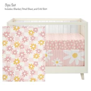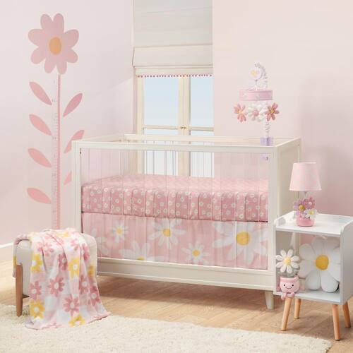 Seu pequeno vai adorar adormecer em um campo de margaridas doces. O conjunto de cama de berço de três peças inclui um cobertor de lã macio e aconchegante, um lençol de berço respirável 100% algodão e uma saia decorativa para berço. O cobertor de lã ultramacio está em um chão quadriculado rosa e branco com margaridas rosa rosa e amarelas beijadas pelo sol. O lençol de berço respirável 100% algodão é em um chão rosa com margaridas brancas doces. Há elástico em toda a volta garantindo um ajuste seguro em um colchão de berço de tamanho padrão medindo 71 x 132 cm. A saia de berço, em um fundo rosa pétala com margaridas de vários tamanhos, tem uma queda de 35 cm. A saia de berço é uma ótima maneira de adicionar o toque final ao berço do seu filho.