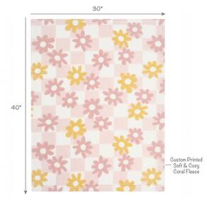 - O luxuoso cobertor de lã macia está em um chão quadriculado rosa e branco com margaridas rosa e amarelas.