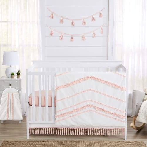 A coleção de roupa de cama de bebê com franjas Boho brancas e rosas da Sweet Jojo Designs criará um visual boêmio simples e sofisticado para o seu berçário. Este conjunto de cama de designer para meninas usa uma variedade única de tecidos especiais exclusivos da Sweet Jojo Designs. Este conjunto é feito com 100% algodão lavado acentuado com franja de macramê de borla e enfeites tufados. A delicada paleta de cores de blush rosa e branco vai deixar seu berçário em alto estilo. Este conjunto da Sweet Jojo Designs serve para todos os berços padrão e camas infantis. A Sweet Jojo Designs cria vários acessórios de sala de coordenação para todos os seus conjuntos de cama infantis, incluindo decoração de parede, cestos, abajures e decorações de janela. - O conjunto de 4 peças inclui: cobertor de berço, lençol de berço com elástico, saia de berço e empilhador de fraldas - Cobertor de berço: 114 cm. x 91,44 cm, lençol de berço com elástico: 132,08 cm. x 71 cm. x 20 cm. bolso, saia de berço: 132 cm. x 71 cm. x 38 cm. Gota, empilhador de fraldas: 15 polegadas. x 50,8 cm. x 15 cm. - Este conjunto apresenta uma variedade única de tecidos especiais exclusivos da Sweet Jojo Designs com franjas de macramê de borla com nó e enfeites tufados - Este conjunto é feito de tecido 100% algodão e pode ser lavado na máquina. Secar em temperatura baixa - Sweet Jojo Designs oferece acessórios correspondentes como lençóis de berço, trocador de fraldas, decoração de parede, tratamentos de janelas, celulares musicais, opções de armazenamento e muito mais. Este design também está disponível em conjuntos de cama de berço, infantil, solteiro e queen.
