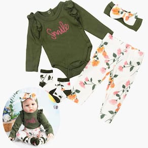 Roupas de bonecas Reborn, acessórios para bebês meninas 61 cm, conjunto de 4 peças, designs especialmente para bebês recém-nascidos de 56 a 61 cm. Adorável body com babados em camadas, calça floral com cintura elástica, faixa de cabeça e meias combinando, super elegante e adorável. Você receberá um adorável conjunto de 4 peças: 1 faixa de cabeça com laço com estampa floral, 1 body em camadas com babados, 1 calça com laço com estampa floral, 1 par de meias adoráveis. (foto). A boneca Reborn não está incluída na embalagem, mas é vendida separadamente. Tecido de qualidade, 100% seguro para o seu bebê. Estrutura resistente, lavável na máquina. todas as estações são adequadas para uso. Os adoráveis conjuntos de roupas de bonecas reborn são tão engraçados que as crianças ficarão felizes em brincar com eles que trarão diversão infinita para o seu pequeno e sua boneca reborn. Leve os conjuntos de roupas de boneca para casa agora, deixe sua boneca renascida mais moderna, descolada e moderna. - Roupas de bonecas Reborn, acessórios de 61 cm, 4 peças, designs especialmente para bebês recém-nascidos de 56 a 61 cm. - Adorável conjunto de roupas de boneca reborn verde oliva com 4 peças, designs exclusivos, cheio de diversão, super moderno e elegante. - Tecido de qualidade, 100% seguro para o seu bebê. Estrutura resistente, lavável na máquina. todas as estações são adequadas para uso. - Lista de pacotes: 1 faixa de cabeça com laço com estampa floral, 1 body em camadas com babados, 1 calça com laço com estampa floral, 1 par de meias adoráveis. (foto). - Ótimo presente para o seu pequeno: os conjuntos de roupas de bebê de bonecas Reborn trarão muita diversão para o seu pequeno e seu bebê renascido.