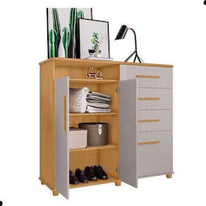 A cômoda é feita em MDP 15mm.Possui 5 gavetas com corrediças telescópicas sendo a ultima com espaço maior, 2 portas, 1 nicho e 3 prateleiras. Tampo em MDF de 20mm.