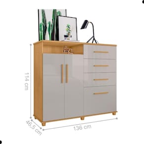 A cômoda é feita em MDP 5 gavetas com corrediças telescópicas sendo a ultima com espaço maior, 2 portas, 1 nicho e 3 prateleiras. Tampo em MDF de 20mm.