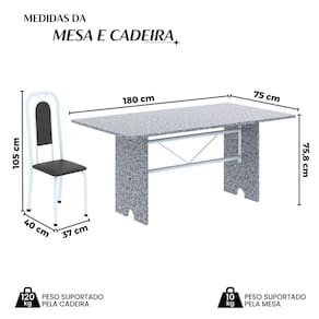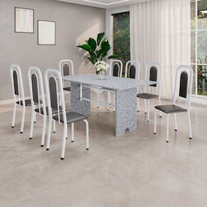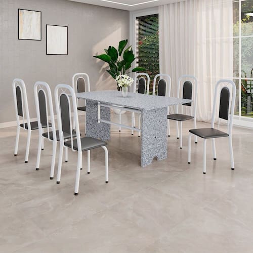 Quer deixar sua casa completa e prática? Uma dica bacana de como transformar o seu lar, deixando-o mais receptivo e bonito? Então você precisa de móveis indispensáveis para deixar seu lar muito mais aconchegante, receptivo e sempre disponível para receber a visita de amigos, familiares e convidados. Você vai se apaixonar por este incrível e moderno Conjunto de Mesa com 8 Cadeiras. Ideal para cozinha, ele é a melhor opção para completar o espaço que você desejar. Aproveite!! Medida da Mesa (A x L x P): 75,8 cm x 180 cm x 75 cm Peso da Mesa: 104,24 kg Mesa suporta até: 10.0000 Acabamento da Cadeira/Banco: Pintura Texturizada Acabamento da Mesa: Pintura Texturizada Ambiente Principal: Cozinha Cadeira/Banco Estofada: Encosto e Assento Estofados Cadeira/Banco estofada: Encosto e Assento Estofados Cadeira/Banco suporta até: 120.0000 codigo_ean: 7900288152862 Complexidade da Montagem: Baixa: pode ser montado por uma pessoa sozinha Cor: Preto / Branco Cor do Produto: Preto / Branco Cor Secundária: Cinza De Canto (Canto Alemão): Não Enchimento do Assento: Espuma D-16 Escala de Brilho: Brilhante Espessura do Tampo: 1,5 mm Estrutura do Assento: MDP Formato do Tampo: Retangular Itens Inclusos: 1 Mesa, 8 Cadeiras, Manual de Montagem e Kit Ferragens Linha ou Coleção: Lara Manual de Montagem e Instalação: https://product-hub-prd.madeiramadeira.com.br/922989053/documents/40129a6b-6b13-4a24-99a8-48b786923f8480282374535281744236778593.pdf Marca: Soma Móveis Material da Base da Mesa: Aço Material da Estrutura da Cadeira: Aço Material do Tampo: Granito Medida da Cadeira/Banco (A x L x P): 105 cm x 37 cm x 40 cm Medida do Tampo (L x C x E): 180cm x 75cm x 1,5 cm Mesa Extensível: Não Necessita Montagem: Sim Origem do Produto: Nacional Peso da Cadeira/Banco: 2,7 kg Possui Apoio Para os Pés: Não Possui Suporte Giratório: Não Quantidade de Cadeiras: 8 Quantidade de Lugares: 08 Recomendações de Uso, Manutenção e Limpeza: Não permitir que molhe os pés da base, usar um pano de tecido macio e seco, evitar detergentes, alvejantes e produtos químicos de limpeza; no tampo usar tecido macio levemente umedecido. Revestimento da Cadeira/Banco: Couro Ecológico Sistema de Montagem: Parafusos Marca: Não Informado
