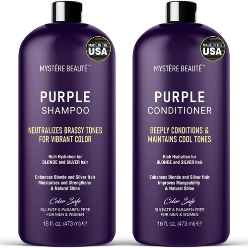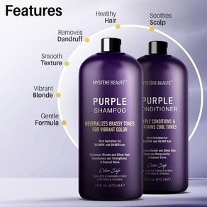 - Consiga e mantenha um cabelo vibrante e saudável com nosso shampoo roxo altamente cotado para loiras e morenas. Combata os tons de latão e amarelo com nosso shampoo anti-amarelo roxo, especialmente formulado para cabelos loiros com mechas e platinados. O conjunto de shampoo e condicionador roxo, enriquecido com ingredientes como extrato de folha de chá verde, extrato de laranja e seda hidrolisada, garante que seus cabelos loiros ou grisalhos permaneçam luminosos e brilhantes.