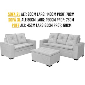 Conjunto de Sofá Turquia em Linho 2 e 3 Lugares com Puff União Feito com materiais de alta qualidade, o Conjunto de Sofá Turquia em Linho 2 e 3 Lugares com Puff União é a combinação ideal de elegância e conforto, com um toque de estilo. Seja para assistir a um filme com a família, receber os amigos para um bate-papo ou simplesmente relaxar depois de um longo dia de trabalho, este sofá é a opção ideal para o seu espaço de convivência. Com design contemporâneo e acabamento impecável, este conjunto de sofás traz um toque especial para qualquer ambiente. O tecido de alta qualidade garante durabilidade e facilidade de limpeza, tornando-o perfeito para famílias ocupadas. O puff incluído no conjunto serve como um apoio extra para os pés ou assento adicional, tornando-o versátil e funcional. Além disso, os sofás de 2 e 3 lugares oferecem espaço suficiente para acomodar toda a família e os amigos. Com o Conjunto de Sofá Turquia em Linho 2 e 3 Lugares com Puff União, você estará garantindo muito conforto para o seu lar.\nMEDIDAS\nAltura (Sofá 3 Lugares) 80cm\nLargura (Sofá 3 Lugares) 190cm\nProfundidade (Sofá 3 Lugares) 78cm\nAltura (Sofá 2 Lugares) 80cm\nLargura (Sofá 2 Lugares) 140cm\nProfundidade (Sofá 2 Lugares) 78cm\nCARACTERÍSTICAS\nFabricante União\nModelo Conjunto de Sofá Turquia em Linho\nGarantia 3 meses\nTipo de Produto Conjunto de Sofá 2 e 3 Lugares\nAmbiente Sala\nEstrutura Madeira Eucalipto de Reflorestamento Seca e Imunizada\nTecido Revestimento Linho\nAssento Cinta elástica, Espuma D26\nEncosto Fixo com Almofadas Soltas Preenchidas com Fibra Siliconada\nMedidas Puff 45x60x85cm\nMaterial Pés Madeira\nINFORMAÇÕES IMPORTANTES\nObjetos decorativos que porventura apareçam na foto, não acompanham o produto. Não nos responsabilizamos pela montagem/instalação dos produtos.\nMontagens, desmontagens e instalações são responsabilidades do cliente. Indicamos que contrate uma empresa de montagem ou um montador de sua confiança.\nAlém disso, favor verificar se os pés e acessórios estão dentro do forro inferior do produto. Em suma, todas as informações divulgadas sobre o produto são de responsabilidade do Fabricante.\nAs cores do produto podem variar de acordo com o seu monitor, a iluminação do ambiente em que você está e até mesmo a sua percepção visual. Além da cor, pequenos detalhes e acabamentos podem não ficar evidentes na foto, por isso as imagens são meramente ilustrativas.