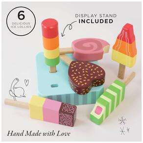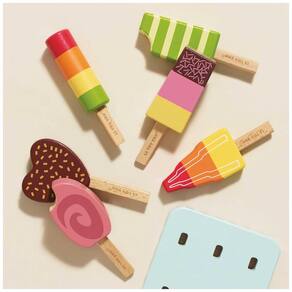 Combine e Misture: Os sorvetes de palito variados podem ser combinados com outros itens de brinquedo da linha Le Toy Van. Cada sorvete se encaixa em um palito de madeira e pode ser exibido na base pintada, criando um visual encantador.