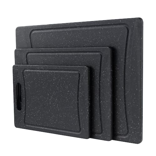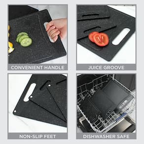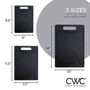 COZINHE COM CORES — Nós realmente nos preocupamos em adicionar o estilo e a aparência certos à sua cozinha. Com nossos produtos, você vai adorar sua cozinha e criar o paraíso com que sempre sonhou. Nosso conjunto de 3 tábuas de corte de plástico são excelentes itens essenciais para a cozinha. Com este conjunto de 3, há uma tábua de cortar para tudo. Os tamanhos pequeno, médio e grande são ótimos para carnes, peixes, vegetais, frutas e queijos. A grande tábua de corte de plástico mede 14" e o tamanho médio mede 12" e a pequena tábua de corte de plástico mede 9,5". Segurança e saúde são uma grande preocupação para nós. Cada tábua de corte de plástico rígido sem BPA para cozinhas apresenta bordas de TPR para garantir uma tábua antiderrapante. A superfície de plástico rígido manterá suas facas afiadas, o que é uma grande preocupação para cozinheiros experientes como você! Lindos estilos em cores modernas ajudarão você a criar o design de cozinha que você absolutamente ama. GARANTIA DE 100% DE SATISFAÇÃO DO CLIENTE: Na Cook with Color, nosso objetivo número um é a satisfação do cliente. Por favor, não hesite em nos contatar com quaisquer problemas, perguntas ou comentários para que possamos garantir que sua experiência de pedido do Cook with Color adicione a cor e o sabor certos! - ADICIONE COR E ESTILO - Entendemos as tendências da cozinha, e nossas tábuas de corte de plástico pequenas, médias e grandes em cores bonitas darão um toque incrível à sua cozinha. - SEGURAS E ANTIDERRAPANTES — Nossas tábuas de cortar de qualidade alimentar sem BPA para carne, peixe, vegetais e muito mais possuem pés de borracha para que você não se preocupe ao cortar suas comidas favoritas. A superfície de plástico rígido manterá suas facas afiadas. - OPÇÕES DE TAMANHOS DIFERENTES - De fatiar carne a picar uvas, este conjunto de tábuas de corte de plástico vem com uma tábua de tamanho excelente para suas necessidades de cozinha. As maiores medidas: 14", médio: 12" e pequeno: 9,5". - ALÇA DE TRANSPORTE E ARMAZENAMENTO - Cada uma de nossas tábuas de corte de plástico rígido possui uma alça fácil de segurar. Essa alça permite que você carregue as tábuas pela cozinha e até mesmo as use para pendurar ao secar e armazenar. Recomenda-se lavar à mão. - GARANTIA DE 100% DE SATISFAÇÃO DO CLIENTE: Na Cook with Color, nosso objetivo número um é a satisfação do cliente. Por favor, não hesite em nos contatar com quaisquer problemas, perguntas ou comentários para que possamos garantir que sua experiência de pedido do Cook with Color adicione a cor e o sabor certos!