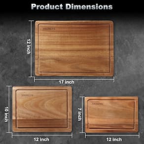 conjunto de madeira de tábua de corte grande - Conjunto de tábua de corte multifuncional – Este conjunto de tábua de corte vem em 3 tamanhos, 43 x 30 cm para cortar carne ou bife, 30 x 25 cm para cortar legumes, 30 x 18 cm para cortar frutas, pães e mais. Três tamanhos de tábuas de corte de madeira para suas necessidades regulares de corte. Elas também podem ser usadas como bandejas para entreter convidados. - Processamento de nova tecnologia: nossa tábua de corte após o novo processo de tratamento de água de bloqueio, este método de tratamento faz com que a tábua de corte do conteúdo de água da placa mantenha uma duração de cerca de 13%, fortalece a estabilidade da madeira, se a tábua de corte é mais sólida não é fácil de rachar e deformação. - Cada tábua de cortar tem uma calha de suco na frente para coletar o excesso de líquido enquanto prepara alimentos, e cada uma tem alças ocultas que podem ser usadas como uma bandeja de entretenimento. - Uso de dupla face – Todas as 3 tábuas de cortar podem ser viradas para uso frente e verso, cada tábua tem uma calha de suco na frente para coletar o excesso de líquido enquanto corta alimentos e alças embutidas para fácil acesso e movimento. - Sobre o uso e cuidados - Enxágue a tábua com detergente comum (não pode ser lavada na lava-louças) e proteja-a com uma aplicação regular de óleo vegetal ou óleo de cozinha para deixá-la bonita e durar mais tempo.