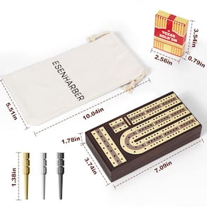 Este conjunto de jogo lindamente trabalhado apresenta um tabuleiro de madeira resistente com um layout sofisticado de 3 pistas, design dobrável ideal para envolver de 2 a 4 jogadores em uma competição estratégica e agradável. A placa está equipada com um fecho magnético seguro, garantindo que todos os componentes permaneçam seguros no lugar durante o transporte ou armazenamento. Incluídos no conjunto estão 9 pinos de metal duráveis, proporcionando uma sensação premium e jogabilidade suave, juntamente com um baralho completo de cartas para começar seus jogos imediatamente. O compartimento de armazenamento integrado mantém todos os pinos e cartões bem organizados, tornando a configuração e limpeza sem esforço. Se você estiver desfrutando de uma noite de jogo aconchegante em casa ou procurando entretenimento em movimento, este conjunto de tabuleiro Cribbage é o complemento perfeito para qualquer coleção, adequado para jogadores a partir de 8 anos. - Design dobrável com fecho magnético: o tabuleiro de cribbage da Esenharber Games apresenta uma construção de madeira premium com uma trava magnética segura, garantindo que o tabuleiro permaneça fechado e protegido durante a viagem ou armazenamento, preservando a integridade dos componentes do jogo. - Pinos de metal duráveis e baralho completo de cartas: incluídos no conjunto estão 9 pinos de metal de alta qualidade que oferecem uma experiência de jogo robusta e tátil, complementada por um baralho completo de cartas de baralho, prontas para uso imediato em seus jogos de Cribbage. - Compartimento de armazenamento integrado: projetado com conveniência em mente, o quadro inclui uma área de armazenamento integrada dentro do quadro que abriga perfeitamente todos os pinos e cartões, simplificando a configuração e garantindo que todas as peças estejam prontamente disponíveis quando necessário. - Layout versátil de 3 faixas para 2 a 4 jogadores: o design clássico de 3 faixas contínuas do tabuleiro acomoda vários jogadores, permitindo jogos competitivos e envolventes entre amigos e familiares, melhorando o aspecto social da noite de jogos. - Portátil e amigo de viagem: dobrável, compacto e leve, este conjunto de tabuleiro de berço é ideal para entretenimento em movimento. Se você estiver viajando ou simplesmente desfrutando de uma noite tranquila em casa, este conjunto é projetado para proporcionar horas de diversão sem ocupar muito espaço.