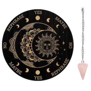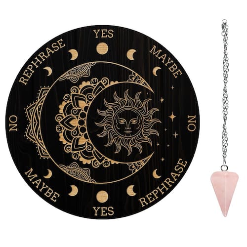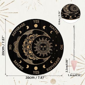 Introdução: Placa de pêndulo de bruxa, incluindo placa de pêndulo de madeira com padrões projetados por designers independentes, 1 peça pêndulo radiestesante de cristal de quartzo rosa natural. Sobre o tamanho Placa de pêndulo personalizada: 7,87 x 7,87 x 0,16 polegadas / 200 x 200 x 4 mm Corrente de cabo de aço inoxidável: 15,7 x 0,06 polegadas / 40 x 0,15 cm Pingente: 0,8 x 0,5 pol. / 2,2 x 1,4 cm Sobre o uso 1. Desmagnetizar o pêndulo de cristal antes de usá-lo. 2. Antes de fazer uma pergunta, faça alguns exercícios. 3. No início, faça algumas perguntas com respostas conhecidas. Quando você for proficiente, você pode fazer perguntas desconhecidas. Neste momento, você deve confiar completamente no pêndulo e não fazer perguntas várias vezes. 4. O pêndulo só pode fazer perguntas de múltipla escolha, mas não se limita à dicotomia de certo ou errado, bom ou ruim. Observação: Considere uma diferença de 1 a 3 mm devido à medição manual. Devido à diferença entre diferentes monitores, a imagem pode não refletir a cor real do item. Obrigado! - Adivinhação de placa de pêndulo: a placa de pêndulo metafísico está entre as ferramentas de adivinhação mais usadas e mais antigas. O pêndulo é utilizado como uma maneira de obter insight espiritual e material. - Excelente qualidade: A tábua de passar é feita de madeira de alta qualidade, sólida e durável, esculpida com padrões requintados cuidadosamente projetados. O pêndulo de cristal de quartzo rosa tem textura dura e não é fácil de danificar. - Design de layout: O fenômeno de um eclipse solar, onde a lua parece envolver o sol, tem sido historicamente associado à adivinhação e adivinhação. Este evento celestial pode evocar sentimentos de mistério, admiração e antecipação. - Sobre o uso: A superfície da placa de madeira é projetada com texto, como sim, não, talvez, reformular, para ajudá-lo a mostrar seu destino. Você também pode fazer perguntas, deixar o pêndulo de radiofrequência balançar naturalmente e obter respostas. - Presente para bruxa: o kit de quadro de radiofrequência é uma ferramenta indispensável para bruxas, que decora perfeitamente a cerimônia do altar da bruxa. É a primeira escolha de presente para amigos bruxos novatos.