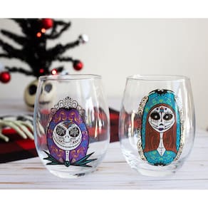 - Feito para fãs da Disney: beba com estas taças de vinho sem haste oficialmente licenciadas com Jack e Sally. Esta bebida exclusiva do Dia dos Mortos é uma adição assustadora a qualquer coleção de utensílios de bar domésticos.