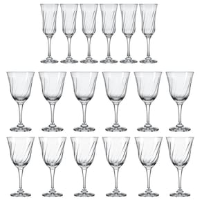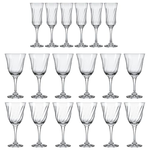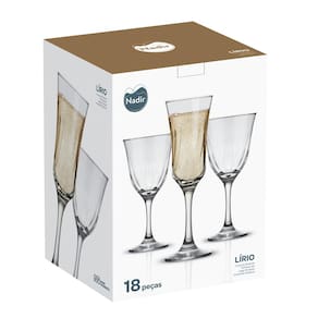 Este belo Conjunto, da Nadir, contém taças para água, champanhe e vinho feitas em vidros e com design sofisticado. Peças perfeitas para acompanhar refeições especiais em família, reuniões descontraídas com os amigos ou mesmo um dia a dia mais requintado.