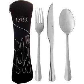Composto por garfo, faca e colher confeccionados em aço inoxidável de alta qualidade, o kit oferece durabilidade e um design moderno, e vem acondicionado em um estojo protetor de neoprene na cor preta, que facilita o transporte e mantém os talheres limpos e organizados.