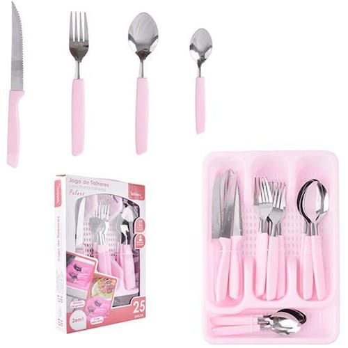 Jogo de Talheres com Porta Talher Rosa 25 Peças