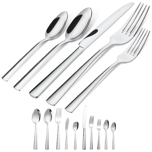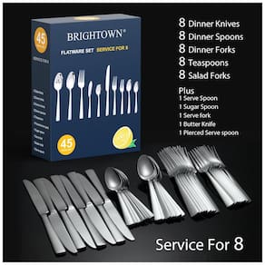 Desfrute de jantares sem preocupações com o Conjunto de Talheres Brightown. Feito em aço inoxidável durável, com design ergonômico que proporciona conforto ao segurar. Este conjunto inclui 8 garfos de jantar, 8 colheres de jantar, 8 facas de jantar, 8 colheres de chá, 8 garfos de salada/sobremesa, além de 1 colher de sopa, 1 garfo de servir, 2 colheres de servir e 1 colher de açúcar. Resistente e elegante, com polimento espelhado que não precisa ser refeito. Fácil de limpar e seguro para máquina de lavar louça.