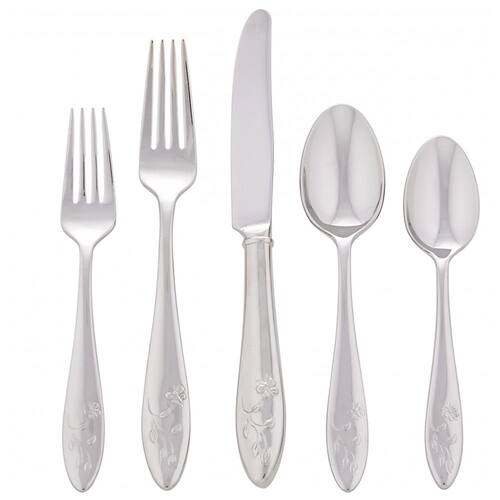 O conjunto de talheres Butterfly Meadow de 5 peças é uma escolha casual e elegante, ideal para uma pessoa. Feito em aço inoxidável 1810, ele é resistente a manchas e apresenta o encantador motivo de borboleta e flor, característico da coleção. Prático e funcional, o conjunto pode ser facilmente lavado na máquina de lavar louça. Ele inclui: