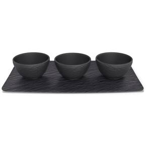 Este Conjunto de Tigelas e Bandeja de Servir com Estilo Moderno da Villeroy Boch traz um toque sofisticado e contemporâneo para qualquer ocasião. Composto por 4 peças, o conjunto inclui tigelas e uma elegante bandeja de servir, todas feitas em cerâmica de alta qualidade e com acabamento preto que exala elegância e modernidade.