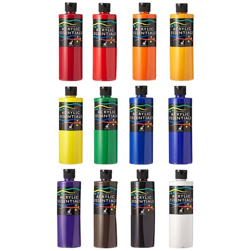 - Acrylic Essentials é uma tinta à base de água que pode ser usada diretamente do recipiente. É ótimo para técnicas de pintura acrílica, incluindo serigrafia, impressão em blocos, têxteis, etc. A tinta é flexível e não descasca ou se tornará giz. Pode ser utilizado com todos os meios Chromacryl.