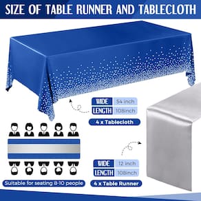 - Tamanhos adequados: a toalha de mesa descartável mede aproximadamente 137 x 274 cm e os corredores de mesa de cetim têm aproximadamente 30,5 x 274,3 cm; Grande o suficiente para cobrir mesas retangulares e redondas ou cortada em qualquer forma que você quiser para decorar