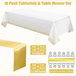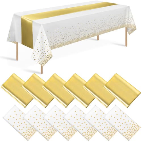 - O que está dentro: Existem 6 toalhas de mesa brancas e douradas, cada uma medindo 137 x 274 cm, juntamente com 6 passadores de mesa dourados de cetim medindo 30 x 274 cm, capazes de cobrir a maioria das mesas retangulares, tornando-as perfeitas para várias festas temáticas elegantes. As lindas toalhas de mesa brancas descartáveis adicionarão brilho à sua festa e criarão memórias queridas.