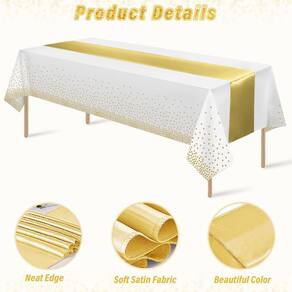 - Alta qualidade: feita com cuidado, a toalha de mesa de plástico de ouro branco é feita de material plástico PE espesso, enquanto o caminho de mesa de cetim dourado é criado usando tecido de cetim macio de alta qualidade. Ambos os itens são confiáveis e resistentes a rasgos, leves, portáteis, impermeáveis e resistentes a manchas. Fique tranquilo, você pode usá-las com confiança para o seu evento.