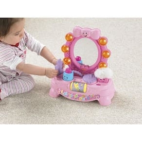 Conjunto de toucador Fisher-Price Baby & Toddler Toy Laugh & Learn Magical Musical Mirror Pretend para bebês de 6 meses ou mais (exclusivo da Amazon) - Ilumine o conjunto de brinquedos fingido com dois modos de aprendizado musical - Mais de 30 músicas, sons, melodias e frases apresentam o alfabeto, contando de 1 a 10, cores e opostos - Abra o compacto ou gire o rolo para ativar músicas, sons e 6 luzes “dançantes” divertidas - Inclui espelho brilhante e 4 acessórios divertidos: pente, batom, pulseira e esponja de pó macia — ajuda a promover brincadeiras de fingir precocemente para bebês e crianças pequenas 6 meses a 3 anos