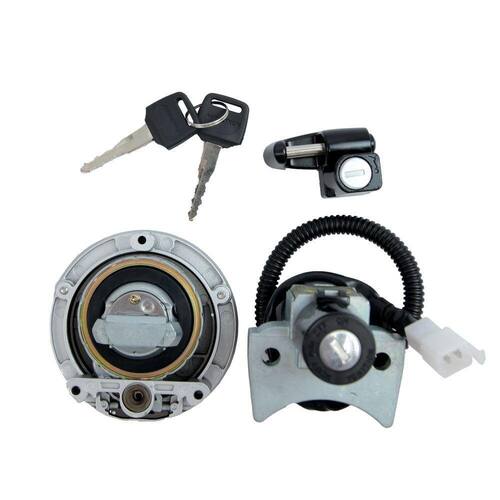 O conjunto de travas tem a função de acionar e/ou destravar, com uma única chave, vários componentes da motocicleta, como: ignição, guidão, tampa do tanque, trava de capacete e trava da tampa lateral.