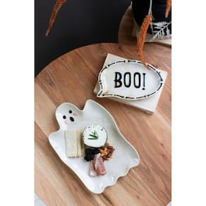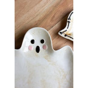 Boo para você! Este conjunto de duas travessas de cerâmica fantasma apresenta um fantasma assustador e seu assustador balão de palavras. Use-o para exibir guloseimas de Halloween ou manter seus doces por perto.