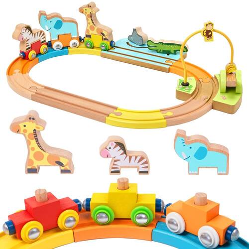 Conjunto de trem de madeira My First com 16 peças - Presente ideal para crianças a partir de 2 anos: se você está procurando um presente de Natal ou apenas um presente diário para seus pequenos, este é o presente! Com este conjunto de trem colorido e finamente projetado, será o novo sucesso de seus filhos e também uma decoração perfeita para o Natal e festivais. - Girafa de madeira, zebra e elefante: as figuras de animais de madeira incluídas são feitas inteiramente de madeira de faia. Use com confiança para uma atividade saudável que afaste as crianças da TV e do telefone. - Design simples e interessante: trilhos de madeira, carros e trens magnéticos podem ser empurrados diretamente à mão. Não há necessidade de baterias extras. Trilho de madeira fácil de conectar. Este conjunto de trem é excelente para crianças praticarem habilidades motoras. - Compatível com as principais marcas: independentemente da marca do seu conjunto de trem, nosso trem de brinquedo de madeira pode combiná-lo facilmente, adicionando mais diversão e criatividade ao layout do seu trem. - Qualidade premium e segura para as crianças brincarem: todas as peças do conjunto são feitas de madeira natural polida e as tintas à base de água são livres de BPA. Com superfície lisa e bordas arredondadas, o conjunto é seguro para crianças brincarem. - Como usar o serviço de garantia da GIRAVO Faça login na sua conta > selecione "Meu pedido" > Localizar a ID do pedido > clique em " com o vendedor". Se você tiver algum problema com nosso conjunto de trem infantil, através da Amazon
