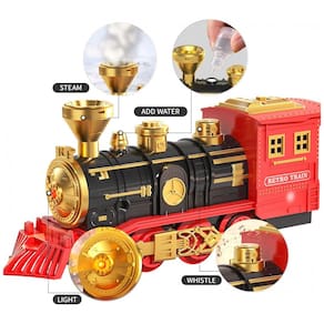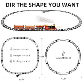 Explore um mundo de diversão ferroviária com o Conjunto de Trem TEMI! Este conjunto completo inclui uma clássica locomotiva a vapor, 2 vagões de passageiros, um vagão de carvão, trilhos curvos e retos, proporcionando uma jornada agradável. Monte os trilhos de forma modular, posicione os vagões e a locomotiva, acenda a luz LED, ouça os sons realistas e veja a fumaça autêntica saindo da chaminé. Com inúmeras peças, este conjunto é ideal para presentear e proporcionar horas de diversão criativa. Aprovado nos testes de segurança dos EUA. Dimensão do layout da pista: 176,0 cm (C) x 106,0 cm (L).