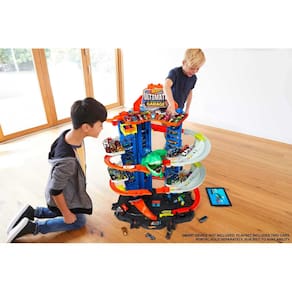 Conjunto de pistas de carros de brinquedo Hot Wheels City Ultimate Garage Moving T-Rex Dinosaur, armazenamento de veículos em escala 100+ 1:64, 3 pés de altura, 2 carros de brinquedo (exclusivo da Amazon) — Inspire a criatividade em uma enorme garagem Hot Wheels, com muito espaço de armazenamento e desafios emocionantes de corrida e acrobacias! - O conjunto de brinquedos possui uma torre vertical com estacionamento (e fácil armazenamento) para mais de 100 carros de brinquedo Hot Wheels -- 2 veículos em escala 1:64 estão incluídos para ação assim que saem da caixa! - Envie carros até o elevador - 2 de cada vez - para acelerar pela pista de corrida lado a lado do topo da torre de estacionamento para um emocionante desafio de descida com grandes saltos aéreos! - Cuidado com o faminto Robo T-Rex que quer devorar alguns deliciosos veículos Hot Wheels. - Expanda o jogo de aventura com vários pontos de conexão que funcionam com outros conjuntos de pistas Hot Wheels (vendidos separadamente) e crie uma cidade única de Hot Wheels.