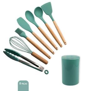 O Conjunto de Utensílios Silicone 8 peças na cor Verde Claro é a escolha ideal para manter a sua cozinha completa e pronta para qualquer receita. Feito totalmente de silicone com cabos de madeira, esses utensílios são de ótima qualidade, resistentes e duráveis, além de oferecerem maior para suas panelas com revestimento, protegendo-as de arranhões e danos.