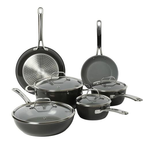 Conjunto de panelas e frigideiras de alumínio forjado Sur La Table Kitchen Essentials de 10 peças sem PFA, interior antiaderente, preto, compatível com indução