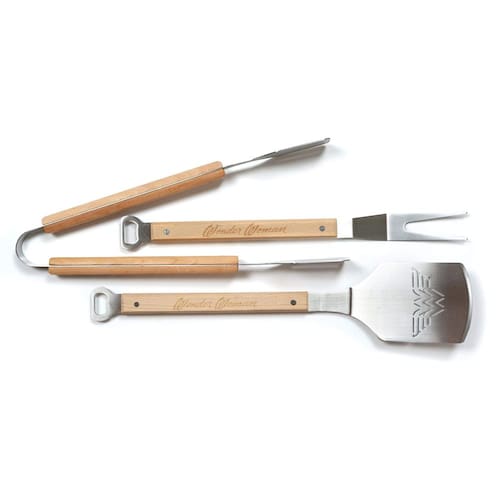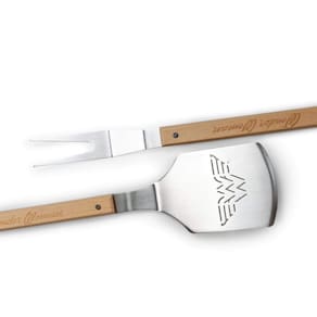 - Grelhe como um super-herói: faça o seu próximo churrasco super com este conjunto de ferramentas com o nome e o logotipo da Mulher Maravilha!