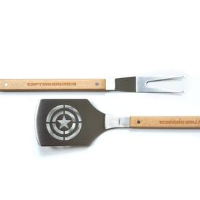 O conjunto de capitão América ferramenta de churrasco é o presente perfeito para dizer graças ao herói do grelhador. Este conjunto de três peças que inclui um logotipo grelhar espátula com uma pega offset e uma alça no abridor de garrafa, um garfo de grelhar com outra abridor de garrafa em a alça, e um par de de cabo longo orifícios de cubos. Agora o pit-master na sua próxima clientes estará pronto para salvar o mundo e hambúrguer inverter. Lavar à mão apenas. Não lava-louças.
