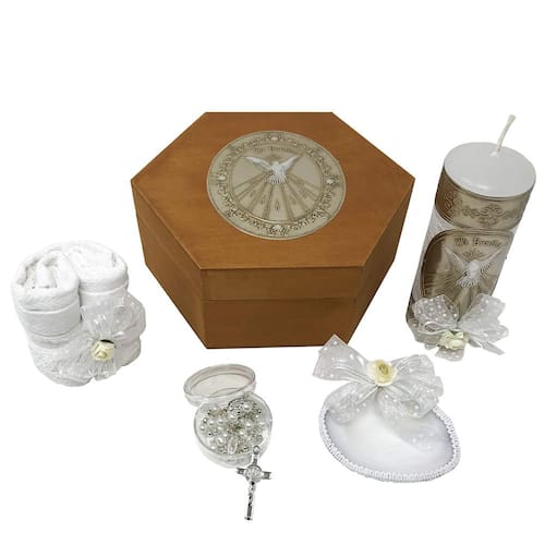 - CAIXA DE MADEIRA: O kit de batismo inclui uma caixa de madeira feita à mão para preservar a toalha, vela, rosário e concha antes e depois do batismo ocorrer. Os itens não são colados, como outros itens em outros kits são.