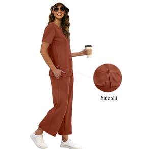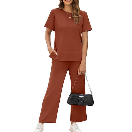 XIEERDUO Conjunto feminino de 2 peças, moda para viagem, fato de treino, confortável, pernas largas, para aeroporto, P-3GG, Ferrugem - Tecido leve como o ar/fluxo de ar ideal/elasticidade em 4 direções. As 2 peças são feitas com tecido espaçador leve, macio e ultra drapeado, projetado para parecer sedoso em sua pele. - Gola redonda básica/manga curta/blusa com fenda lateral. Esta túnica confortável é longa o suficiente para cobrir seus quadris, esconder sua barriga - Comprimento curto (9/10)/ Calça com cordão de cintura elástica/calça de moletom de perna larga. Calça com dois bolsos laterais práticos, ajuda a segurar seu celular, chaves, moedas e batons facilmente, pare de se preocupar com onde colocar seu telefone enquanto você está trabalhando/praticando esportes - Pode ser vestido por cima ou por baixo, ótimo para uso casual/vestir-se/férias/viagens/negócios casuais/trabalho/exercícios - Lavar à máquina em água fria, secar em temperatura baixa ou pendurar para secar. Passar a ferro em configurações baixas. A embalagem Acuum pode causar rugas na parte superior, mas lavar ou passar a ferro as refrescará