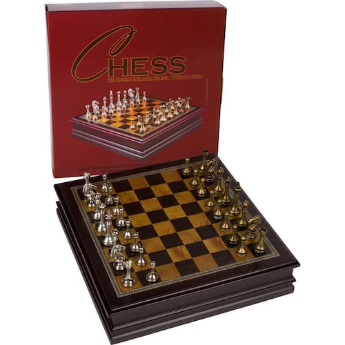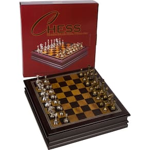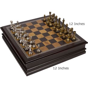 O tabuleiro de xadrez de madeira Grace de 30,5 cm de tamanho médio do Best Chess Set traz uma elegância discreta para cada jogo que você jogar com ele. É lindamente feito, mas não é excessivamente ornamentado a ponto de distração. Ele possui quadrados de madeira incrustados com corte preciso feitos de madeira de ébano e burl da Itália. Além disso, o tabuleiro se levanta para permitir fácil armazenamento das 32 peças de xadrez dentro da capa. As peças de metal são feitas de uma liga de zinco durável com acabamento galvanizado em bronze e prata. Além disso, elas são acolchoadas na parte inferior para proteger sua prancha. O rei tem 6,3 cm de altura com uma base de 2,2 cm de diâmetro. O peso total deste conjunto com peças vem em 1,7 kg. Certifique-se de medir nossas dimensões declaradas para ver se elas se encaixam às suas necessidades antes de fazer o pedido. Vem em embalagem de varejo. Best Chess Set é uma empresa sediada na Califórnia e este produto é montado na China em nossa própria fábrica de qualidade controlada. - Dimensões totais da placa: 30,48 x 30,48 x 7,62 cm (médio) (verifique se as dimensões se encaixam às suas necessidades antes de comprar), tamanho individual do quadrado da placa: 3 x 3 cm, peso completo do conjunto com peças: 1,73 kg - Altura King: 6,35 cm, Diâmetro da base King: 2,20 cm, Peso King: 20 g, Altura do peão: 3,5 cm, Diâmetro da base do peão: 3,4 cm, Peso do peão: 8,5 g - Tipo de peça de xadrez: metal (liga de zinco) em acabamento prata e bronze, peso inferior de feltro acolchoado - Tipo de placa: madeira embutida de burl e ébano (madeira cultivada na Itália a partir de fontes ecológicas), armário: madeira de bétula (madeira cultivada na China a partir de fontes ecológicas), armazenamento interior para peças - Vem com placa, conjunto completo de 32 peças e instruções (sem garantia de versão em português)