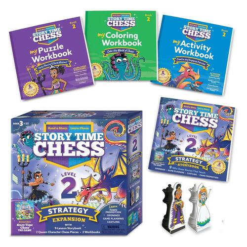 Transforme peões, brinque com dragões e busque novas aventuras com a expansão de estratégia Story Time Chess Nível 2! Apresentando um livro de histórias ilustrado com nove capítulos totalmente novos, bem como livros de quebra-cabeça, atividade e colorir, nosso pacote de estratégia de nível 2 tem tudo o que seu filho precisa para continuar lutando pelo sucesso no xadrez. Os novos tópicos de xadrez incluem: - de peões - Castling - Estratégia de abertura - Análise do tabuleiro - Fazer um plano Deixe a expansão da estratégia de nível 2 do xadrez levar você para o mundo caprichoso do Chesslandia. Peça o seu hoje e leve o jogo do seu filho para o próximo nível!
