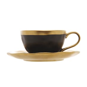 As 6 xícaras de cafezinho acompanham pires em porcelana preta com detalhes dourados, criando uma composição elegante e moderna para mesas postas e bandejas de café. Com 90 ml, são ideais para servir o cafezinho com charme, conforto e estilo no dia a dia ou em ocasiões especiais.