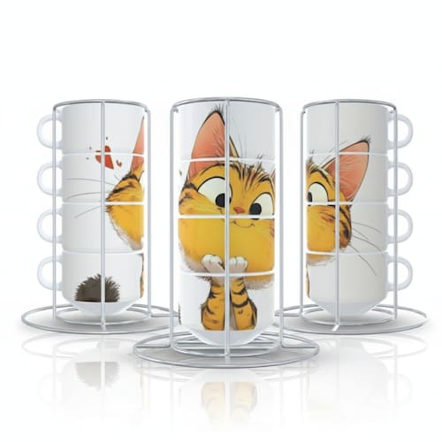 Jogo 4 Xícaras 150ml Cerâmica Empilháveis com Suporte de Metal - Gatinho Fofo