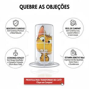 "Será que é resistente?" Sim! Nossas xícaras são feitas de cerâmica de alta qualidade, projetadas para o uso diário. O suporte de metal robusto garante estabilidade e durabilidade, protegendo suas xícaras.
