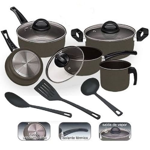 O Conjunto é composto por: 01 Panela diametro 16 cm 01 Panela diametro 18 cm 01 Caçarola diametro 18 cm 01 Fervedor diametro 14 cm 01 Frigideira diametro 18 cm 01 Espátula de Nylon 01 Colher de Nylon 01 Concha de Nylon