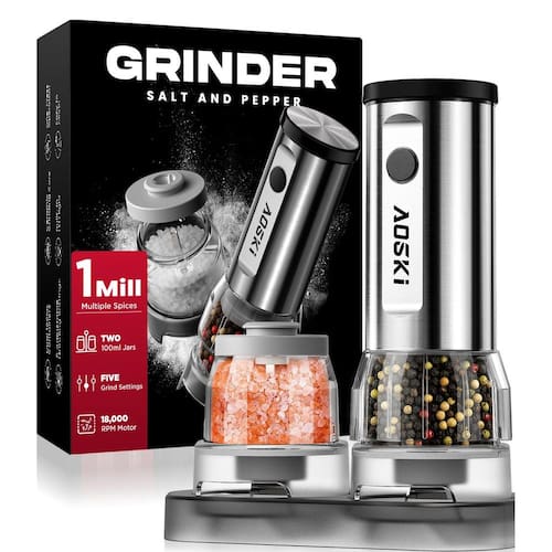 - Operação sem esforço com uma mão com energia da bateria: tempere com o apertar de um botão — sem necessidade de torção. O conjunto de moedores elétricos de sal e pimenta Aoski funciona com 4 pilhas AAA (não incluídas), dando a você conveniência sem fio a qualquer hora, em qualquer lugar. Ideal para cozinheiros ocupados, idosos ou pessoas com força limitada à mão, oferece controle sem esforço e desempenho consistente sem a espera de recarregar ou o incômodo dos cabos