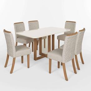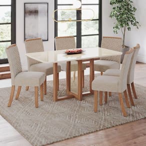 Para quem busca conforto, beleza sofisticação e praticidade, a sala de jantar Érika foi pensada justamente nesses pontos e na facilitação da montagem. Ela possui tampo de MDF de 25mm com pintura UV nas duas faces o que garante maior durabilidade. essa versão com tampo de 1,60 é ótima para quem busca otimização do espaço. Medida da Mesa (A x L x P): 80 x 160 x 90 Cm Peso da Mesa: 52 Mesa suporta até: 40 Acabamento da Cadeira/Banco: Pintura Texturizada Acabamento da Mesa: Pintura UV Acompanha Manual de Instalação: Sim Almofada do assento: Fixa Altura do Conjunto: 98 Ambiente Principal: Sala de Jantar Cadeira/Banco estofada: Encosto e Assento Estofados Cadeira/Banco suporta até: 120 Complexidade da Montagem: Média: pode ser montado por mais de uma pessoa e/ou necessite de maior conhecimento para montagem Cor: Marrom/Off White/Linho Cor da Base: Marrom Cor do Produto: Marrom/Off White/Linho Cor do Tampo: Off White Cor Flex: Não Cor Secundária: Marrom De Canto (Canto Alemão): Não Enchimento do Assento: Espuma D-23 Enchimento do Encosto: Espuma D-15 Escala de Brilho: Brilhante Espessura do Tampo: 25 Estrutura do Assento: MDP/MDF Estrutura do Encosto: MDP/MDF Formato do Tampo: Retangular Itens Inclusos: 1 Sala de Jantar, Parafusos e Cavilhas e Manual de Instruções Linha ou Coleção: Érika Manual de Montagem e Instalação: https://product-hub-prd.madeiramadeira.com.br/898822/documents/71ca42d3-4877-4ecc-8e5d-40d9d3005ccbkamesa120cmctarredcvid4cad.pdf Material da Base da Mesa: MDP Material da Estrutura da Cadeira: MDF/MDP Material do Tampo: MDF Material Principal: MDF/MDP Material Principal das Cadeiras/Bancos: MDP Medida da Cadeira/Banco (A x L x P): 98 x 44 x 60 Medida do Tampo (L x C x E): 80 x 160 x 2,5 Cm Mesa Dobrável: Não Mesa Extensível: Não Montagem Flex: Não Necessita Montagem: Sim Origem do Produto: Nacional Peso da Cadeira/Banco: 8.5 Possui Apoio para Braços: Não Possui Apoio Para os Pés: Não Possui Prateleiras: Não Possui Rodízio: Não Possui Suporte Giratório: Não Possui Vidro: Não Quantidade de Cadeiras: 6 Quantidade de Lugares: 06 Recomendações de Uso, Manutenção e Limpeza: Para limpeza de seu móvel, use uma flanela limpa e seca. Não utilize produtos químicos que possam danificar o produto. Revestimento da Cadeira/Banco: Linho Sistema de Montagem: Parafusos e Cavilhas Tipo de Assento: Fixo Tipo de Encosto: Fixo