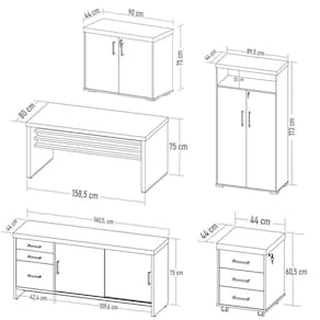 Conteúdo da Embalagem: 1 Mesa, 1 Gaveteiro, 1 Armário Alto, 1 Balcão 2P, 1 Balcão 2P 3Gv.